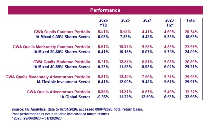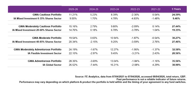 Please note that any performance figures are provided for information purposes only. The performance of your own investments may deviate from the returns shown below due to a number of factors, including product charges, the timing of contributions & withdrawals and portfolio rebalancing. Performance relates to the GWA Portfolios only; if you hold other investments performance will be different.