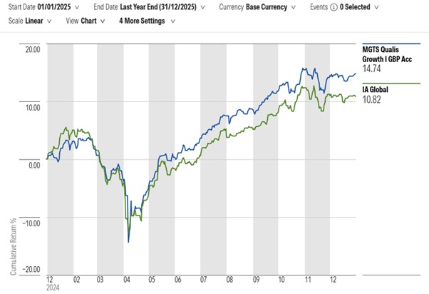 2025 was a strong year for global equities, but it was also a year when where you were invested mattered just as much as being invested. Against that backdrop, MGTS Qualis Growth delivered a return of +14.74% in 2025, outperforming the IA Global sector by +3.92%.